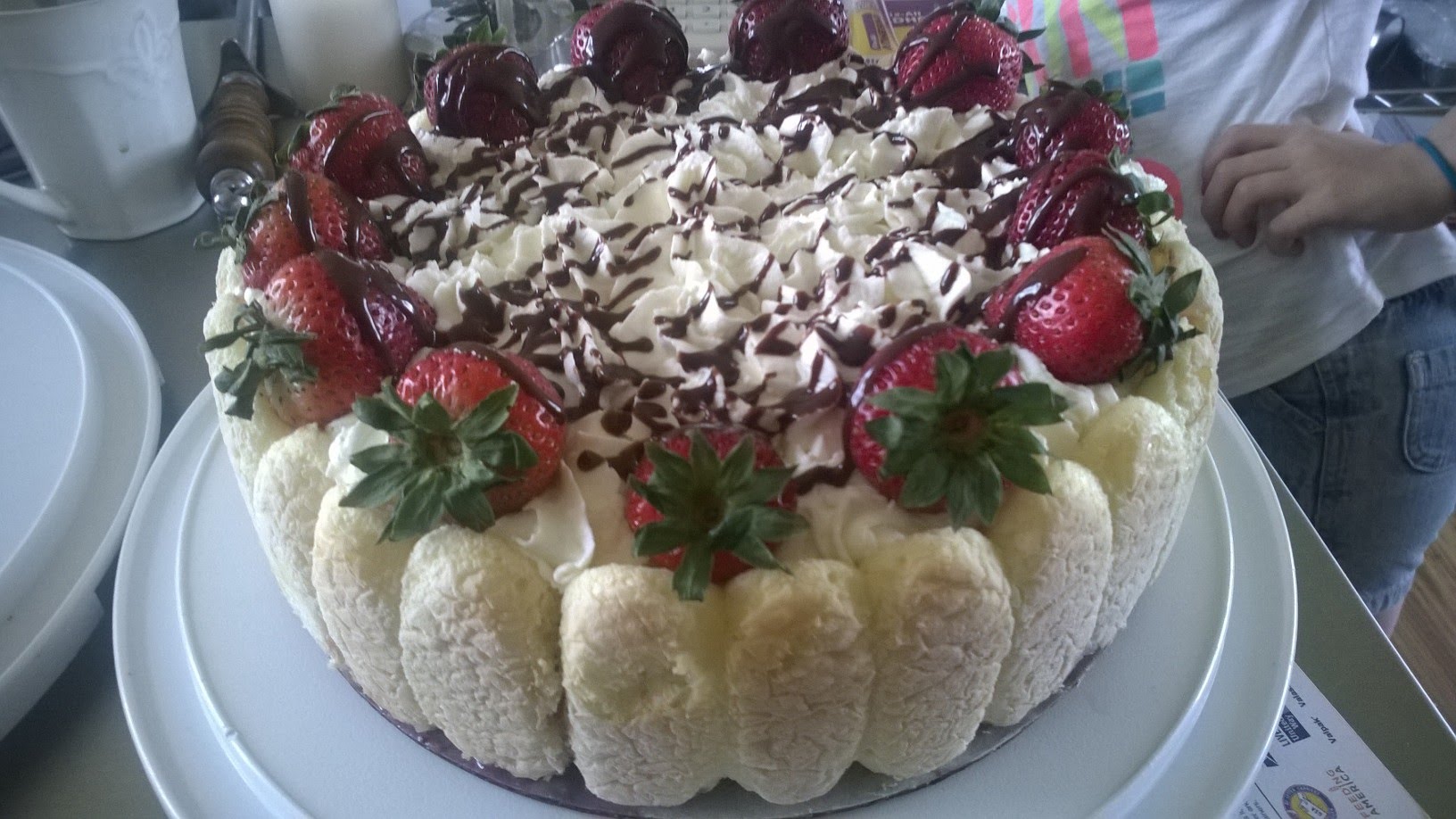 - Strawberry Torte garnished with chocolate-dipped fresh strawberries