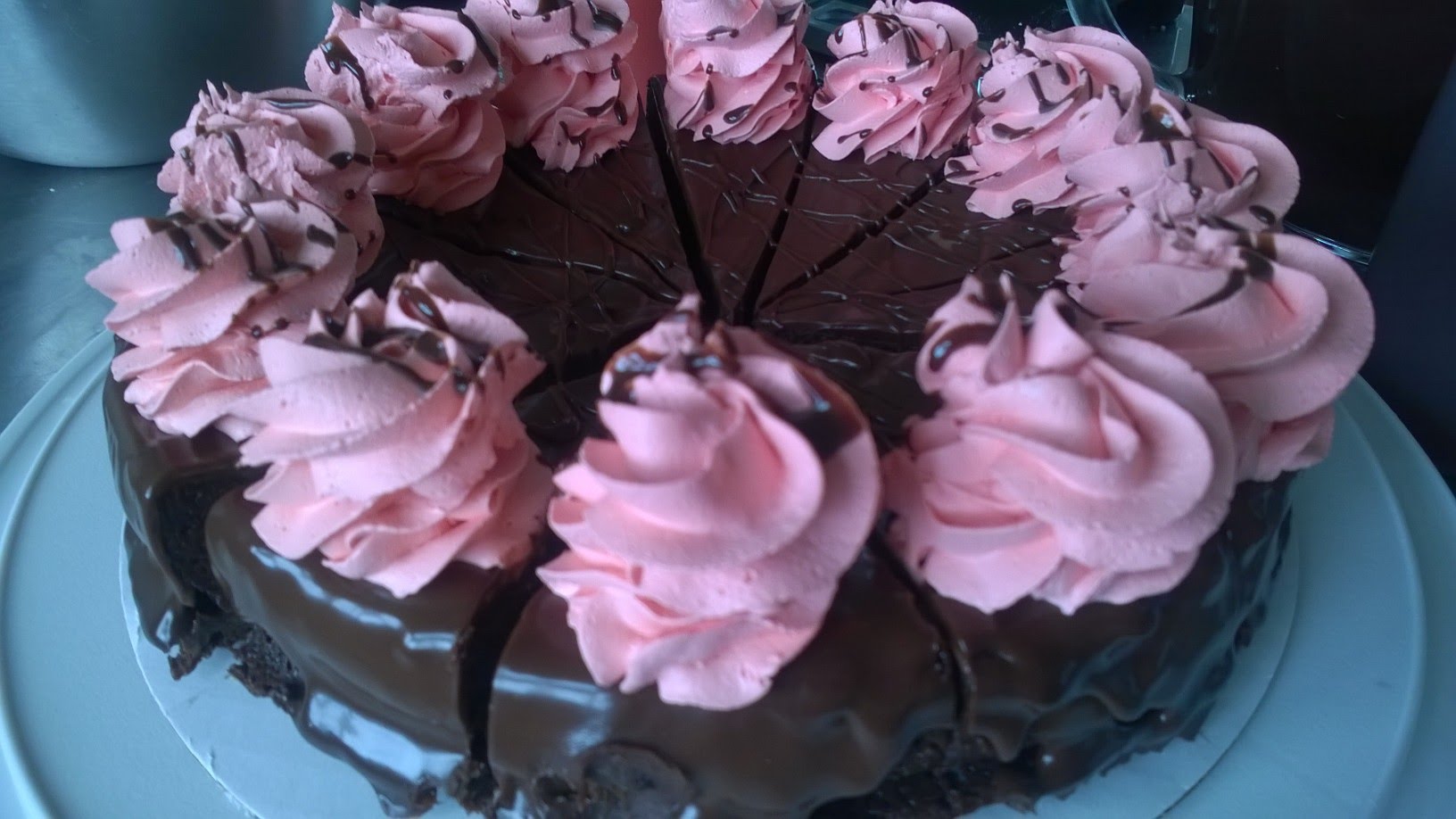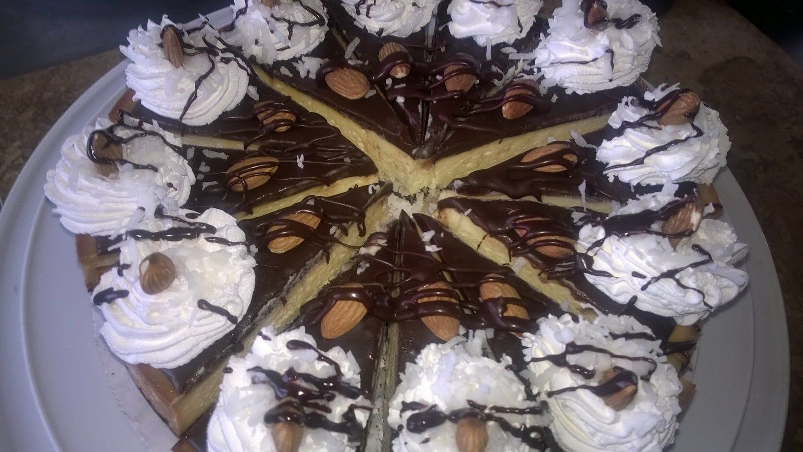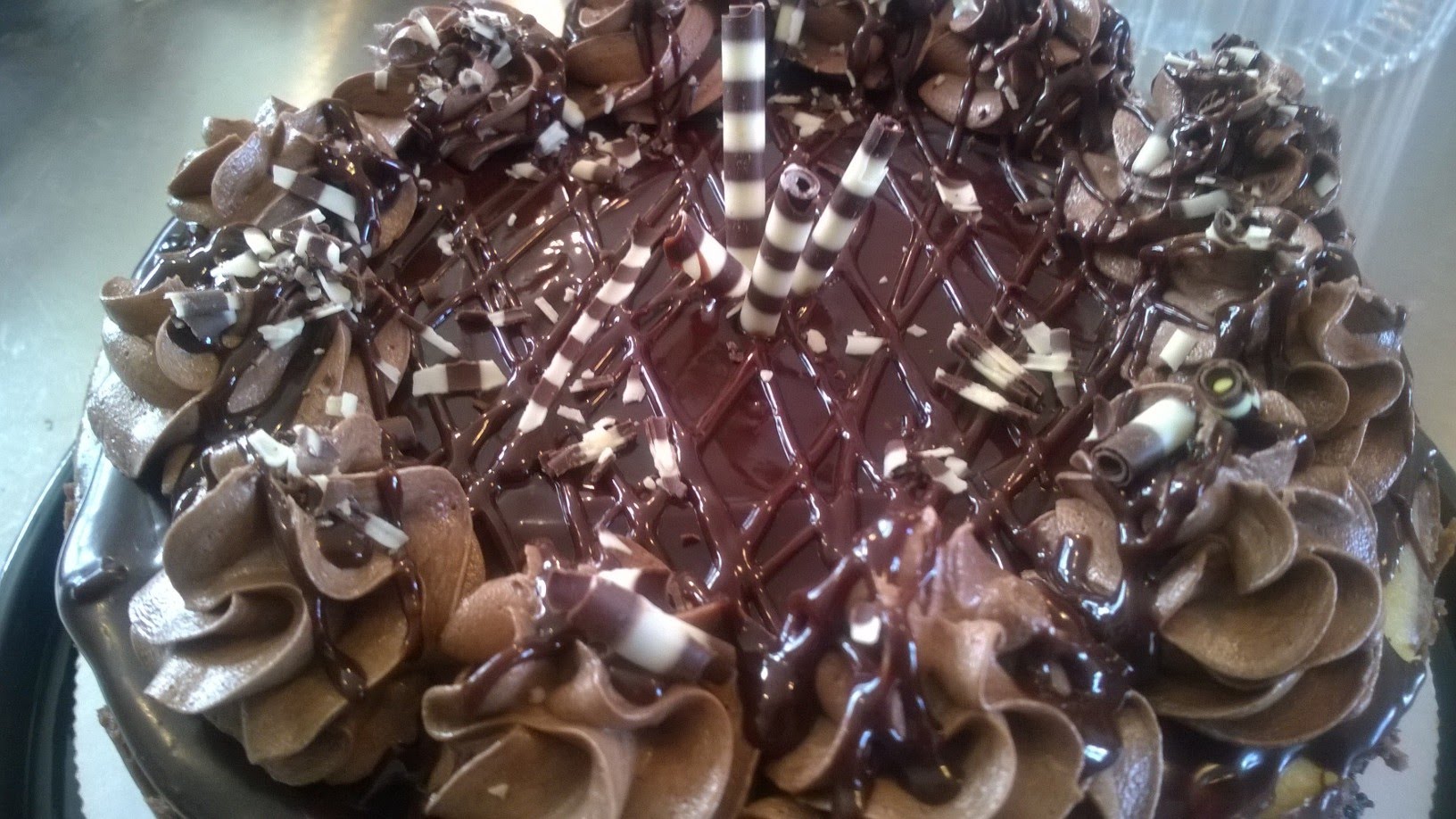 - Cappuccino Torte garnished with chocolate straws & espresso powder